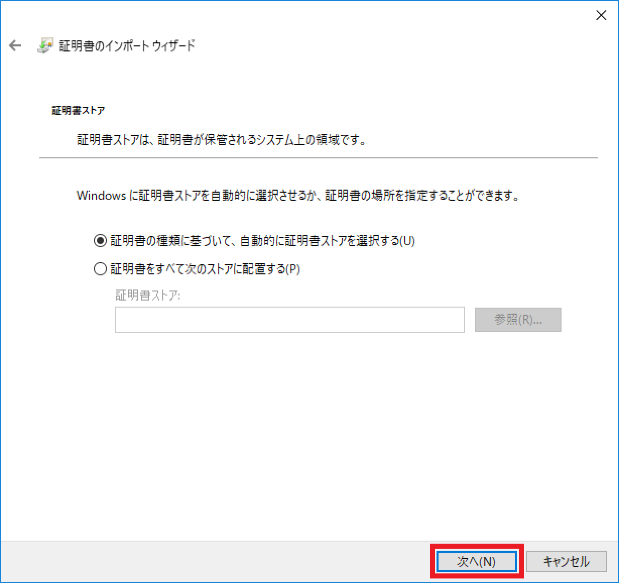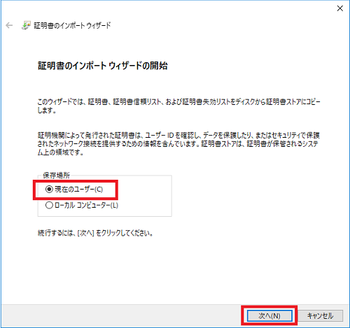 証明書のインポートウィザードの開始が表示されます。