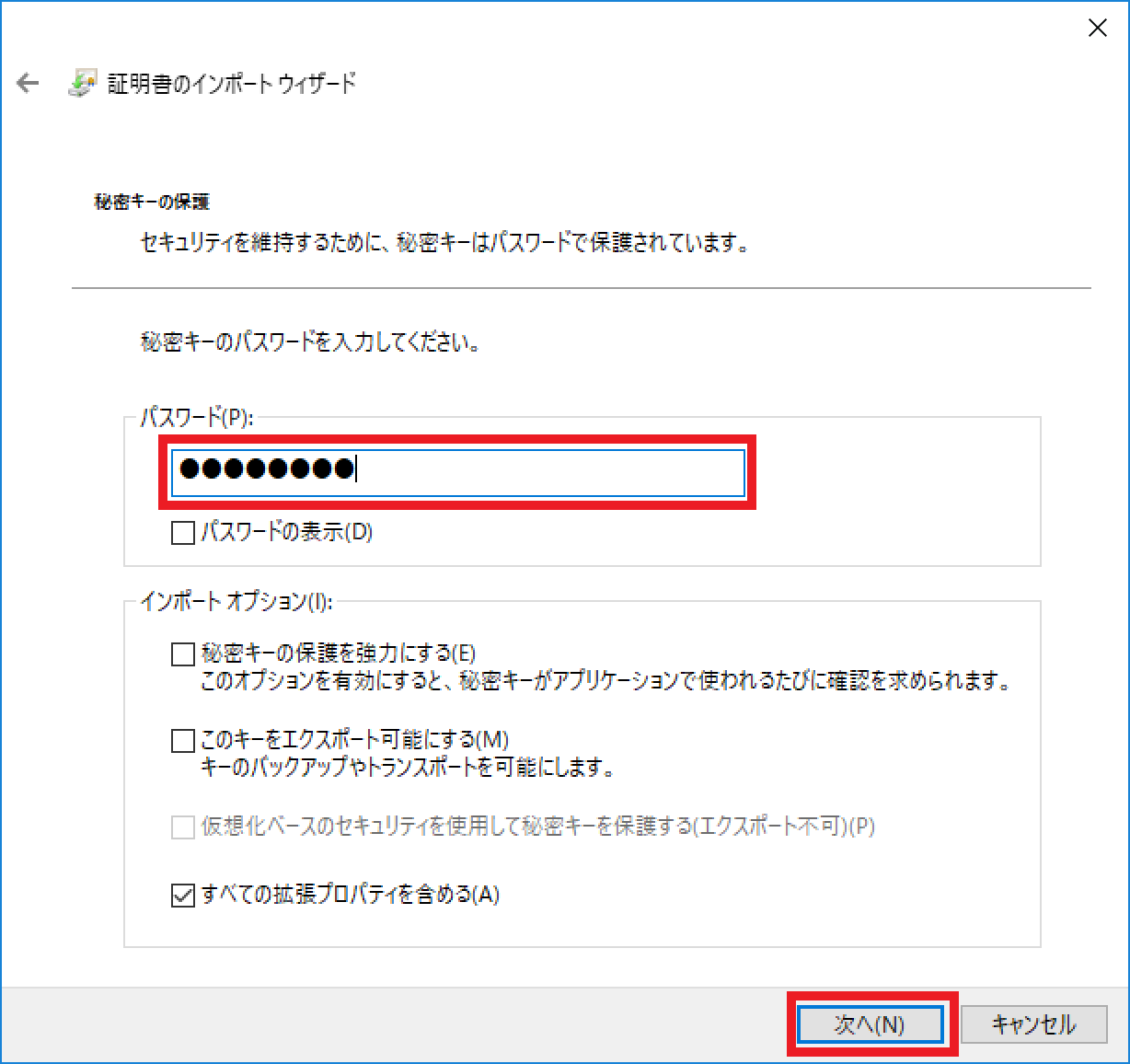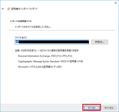 『パスワード』に証明書取得用パスワードを入力後、『次へ』ボタンをクリックします。